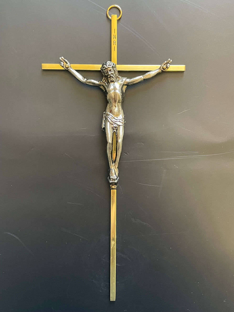 Solid-cast brass crucifix depicting Jesus Christ on the cross symbolizing His crucifixion and sacrifice for humanity’s sins. The letters “INRI” are placed at the top of the cross by order of Pontius Pilate during Jesus crucifixion. In Latin, these letters stand for, “Jesus of Nazareth, King of the Jews.”